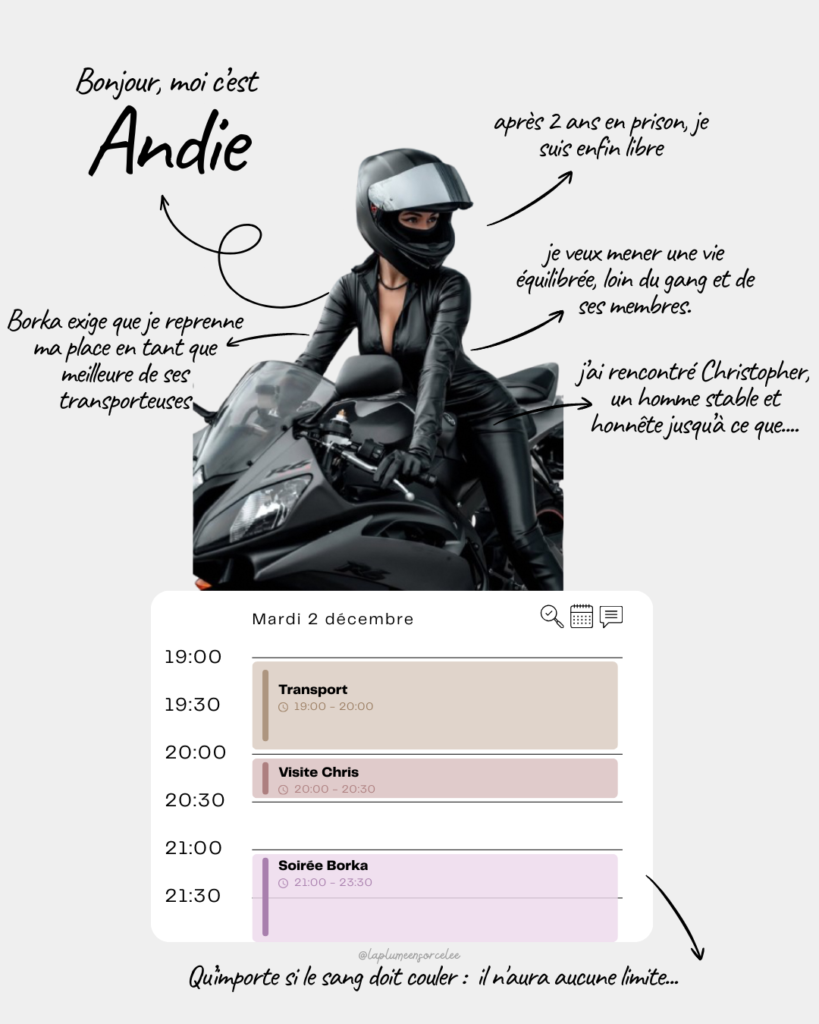 Pourquoi, je ne saurais le dire… j’ai bien aimé le caractère de Borka – aussi mauvais soit-il. L’amitié sans faille de Coline, la douceur de Tori, Ben, Chris et les autres : ils ont su me charmer. Diego m’a touchée et la place de la moto dans cette histoire >>>> qu’est-ce que j’ai aimé (d’ailleurs, j’en ai fait un clin d’oeil dans ma photo).
