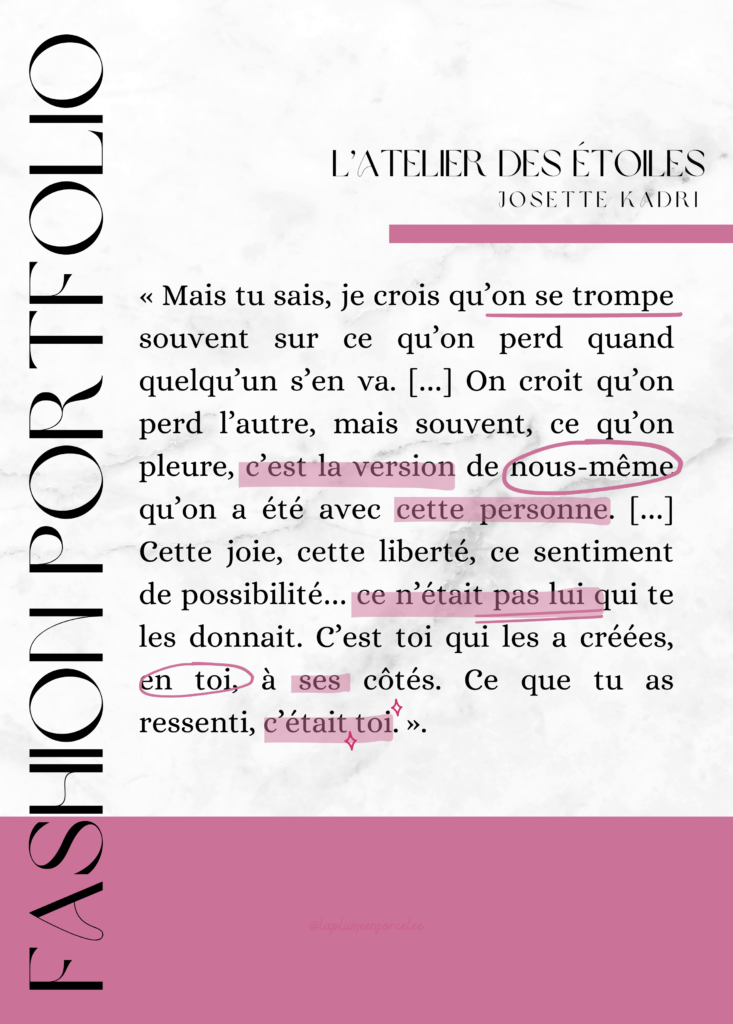 Wahou! Je suis bluffée par votre composition visuelle et citations, on sent à quel point le monde de la mode vous a inspirée ! Merci pour cette lecture si attentive et créative, c’est un vrai plaisir de voir le roman prendre vie à travers votre regard.