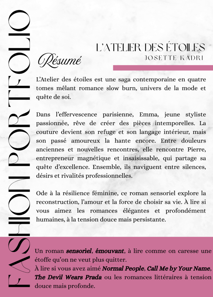 Bienvenue dans l’Atelier des Étoiles, premier tome (sur 4) d’une romance contemporaine écrite par Josette Kadri !