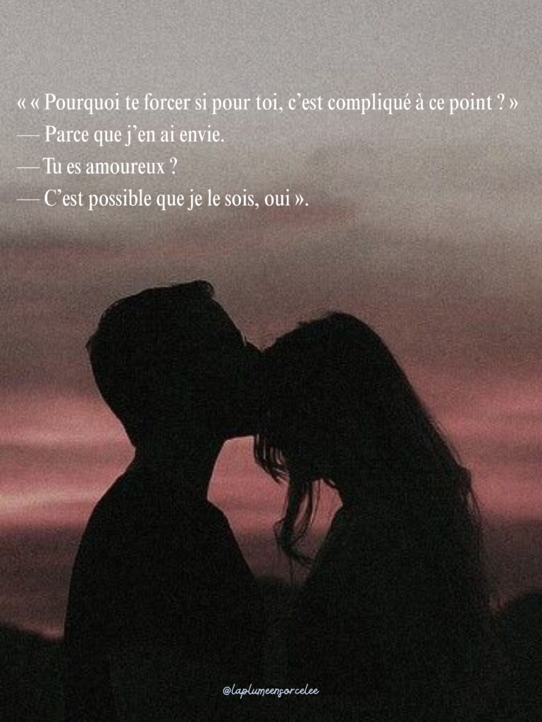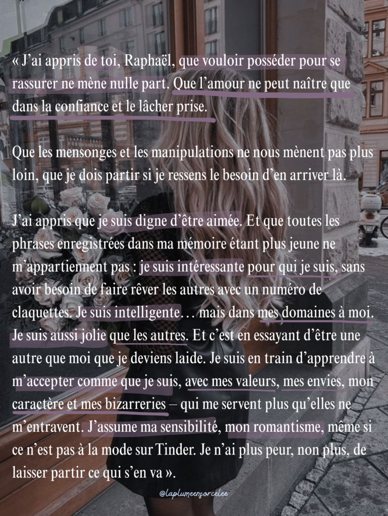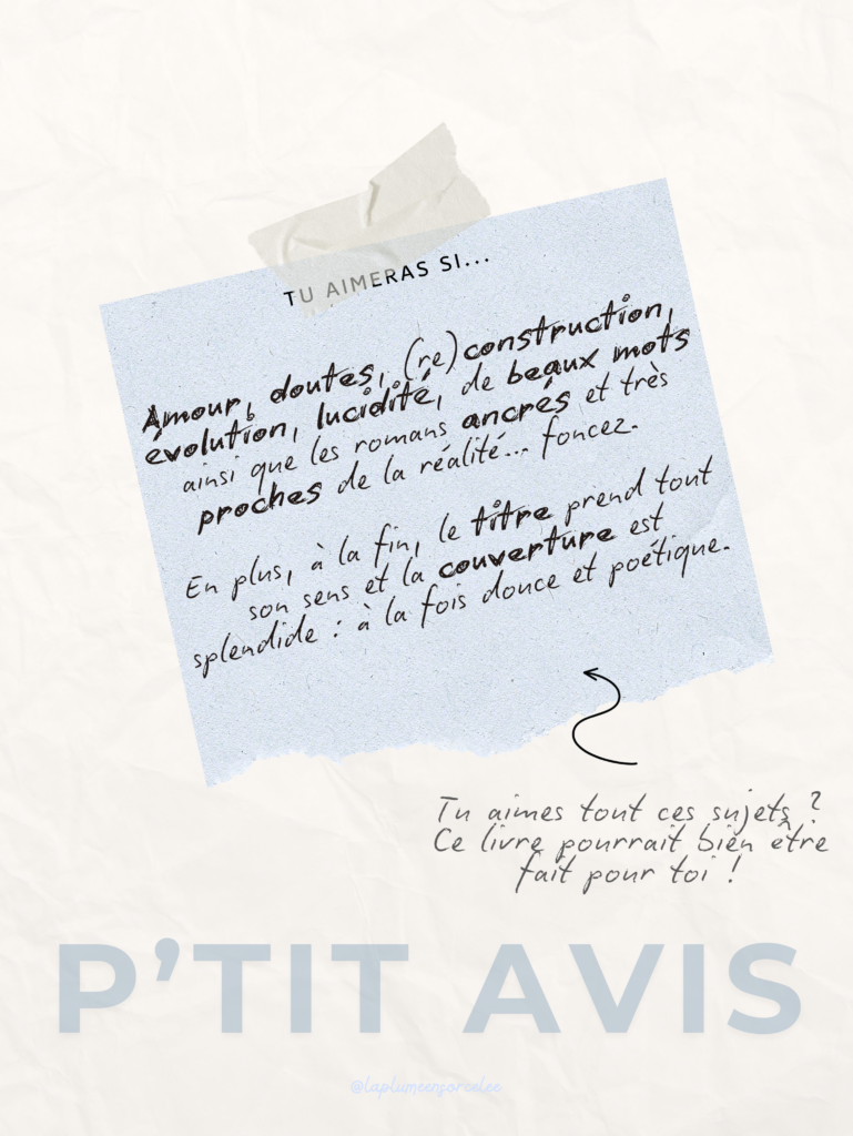 Amour, doutes, (re)construction, évolution, lucidité, de beaux mots ainsi que les romans ancrés et très proches de la réalité… foncez. Je crois bien que ce roman pourrait vous plaire. En plus, à la fin, le titre prend tout son sens et la couverture est splendide : à la fois douce et poétique.